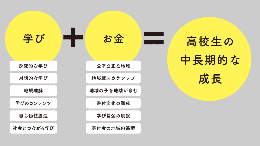 未来に向かって歩みを進める高校生が挑戦をしようとするとき、資金や相談、サポートする人材の不足が足かせになってはなりません。高校生が挑戦し、(中長期的にも)成長するためには、地域全体のさまざまな資源を活用し、学びを支える体制が不可欠です。
