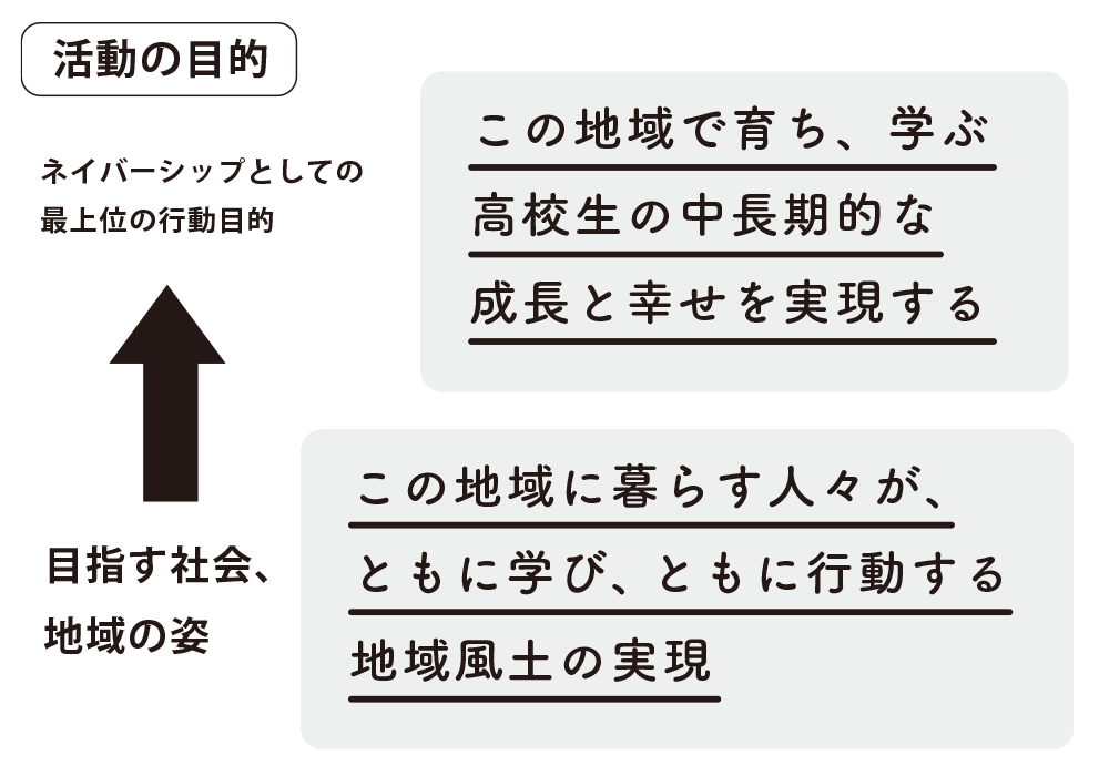 ネイバーシップは、この地域で育ち、学ぶ高校生たちの中長期的な成長と幸せを実現するために、大人と高校生が共に気付き、考え、行動できる未来を目指します。みんなが互いに支え合い、共によりより社会をつくっていくため、人や資金といった地域の資源を広く康平に分かちあうきっかけづくりを実践します。